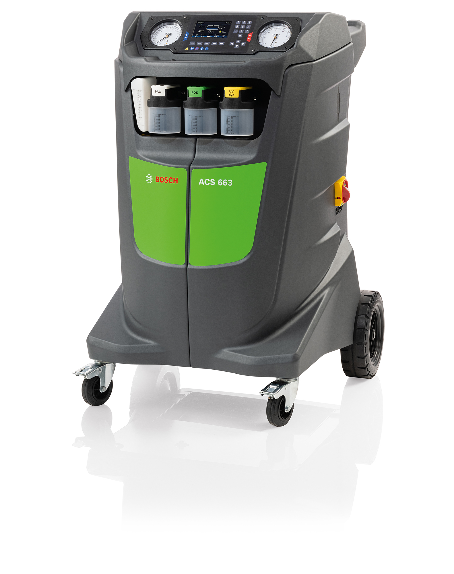 Two oil bottles for PAG and POE lubricants along with an automatic flushing function make the unit compatible with hybrid and electric vehicles too.